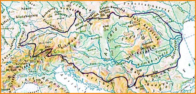 Eŭropo. La tuta areo de la riverbaseno de Danubo estas kvazaŭ 800 000